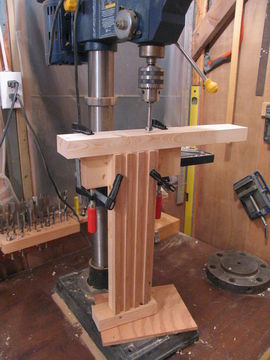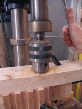 Next remove the horizontal table support piece, but leave the block clamped to the upright. Unless you have a very long 5/8" drill, your holes will not be deep enough, so drill them to a full depth of 2.5 inches after removing the table support part.