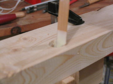 Next use a thin scrap of wood to apply glue to the inside of the hole (Fig 14) and also to the dowel. Insert the dowel in the hole. Ideally, the dowel fits rather tightly and needs a mallet to drive in (Fig 15)