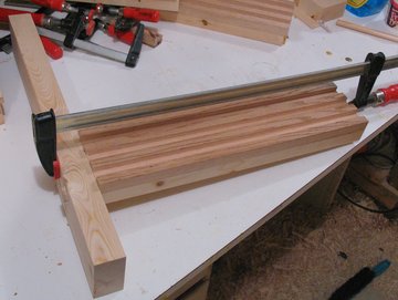 Next assemble the leg pieces. These are just like the table supports, with the difference that the legs are a bit wider. We can use the same guide block for the legs as well. Be very careful that you put the uprights on the legs with the grooved pattern facing the opposite way, so that they will mate with the grooved pieces of the uprights. That is, other than the horizontal part being a little larger, the grooves / slots of the uprights should be a mirror image of those joining the table supports, so that they will mate correctly when you put the table together.