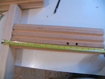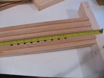 In the uprights attached to the legs, drill two holes, 1.5" apart, one 11.5" from the bottom of the leg and the other 13" from the bottom of the leg (Fig 19). Make these a little larger - 7/16th in diameter, to allow for a bit more room.