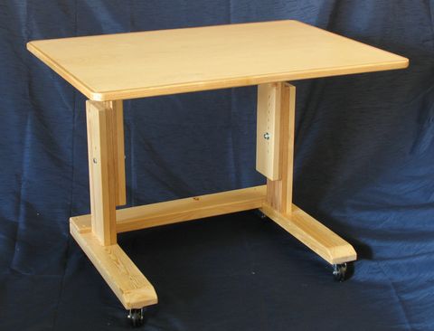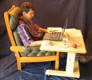 This table design is intended to allow for working in unusual seating positions. I originally came up with this concept when I wanted to work from remotely from my girlfriend's place in another city. I wanted a table that I could be set up to be ergonomic with any seating opportunity I could find. I also wanted to be able to wheel the table out of the way and into a spare room while not in use.