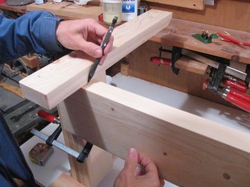 Next drill holes for the screws to hold the table against the table supports and cross pieces. Select what screws to use, then drill to such a depth so that the screws, when bottoming out in the holes, will not penetrate the table top. With a 1/2" thick table top, its all too easy to end up having your screws come out the top.