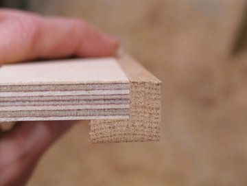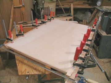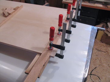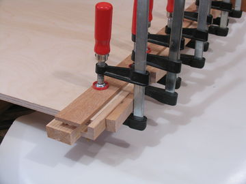 Then apply glue to the L shaped piece and to the edge of the plywood, and slide the L shaped piece against the plywood. Use wedges to push the L shaped piece against the plywood, then use more clamps to force the L piece together (Fig 29). Edge clamps would be really handy for this, if you happen to have lots of them.