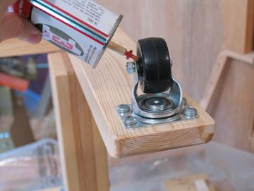 Apply a little bit of oil or grease to the castors after mounting them, both to the wheel bearing (Fig 32), as well as the bolt going through the swivel mechanism. I find that castors generally only come with grease in the swivel ball bearings, causing the other bearings to often squeak while being moved. The way I use this table is to pull it up to me after I sit down, so having the castors roll freely without squeaking is important.