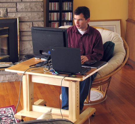 When working at the computer, it's important to have a desk and chair that go well together so that I can sit comfortably and focus on my work. I didn’t want to get a fancy office chair like they had at work. Instead, I figured a variety of seats could be very comfortable if the desk was at just the right height to go with them. For example, a couch, with pillows behind the back is quite "configurable" and comfortable for long stretches, but not when used with a normal desk of regular height.