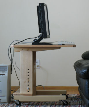 So built a height adjustable small computer ‘desk’ so that I could take it there and adjust it to whatever was optimal to go with the available seating options – whether it be a couch, a chair, or whatever.