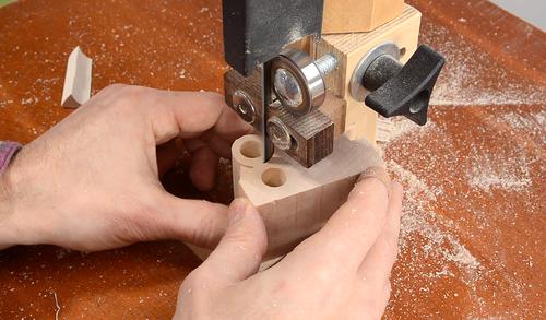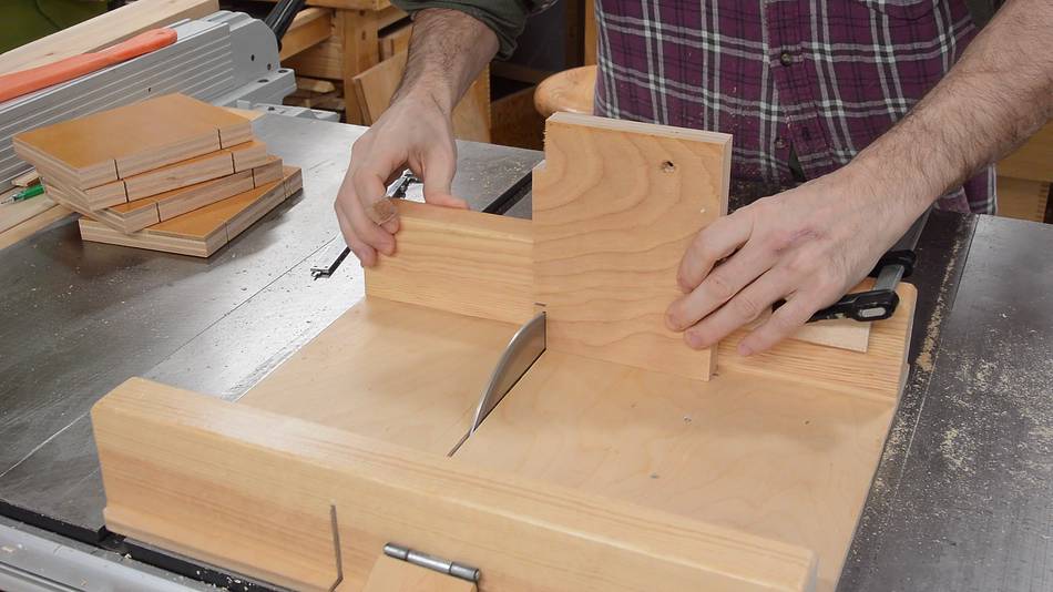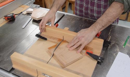 Jigged up for cutting the sloped sides of the trapezoidal pieces,
