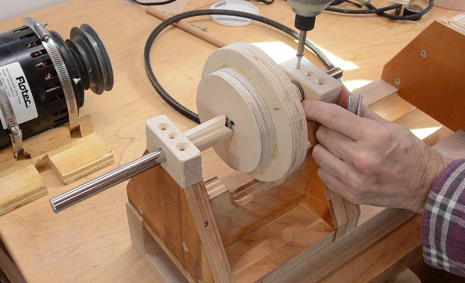 With the bearing block placed on the headstock, I tap the screws to