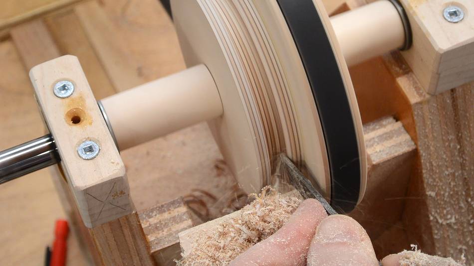 Then turning the V-groove in the larger disk. The chisel often got