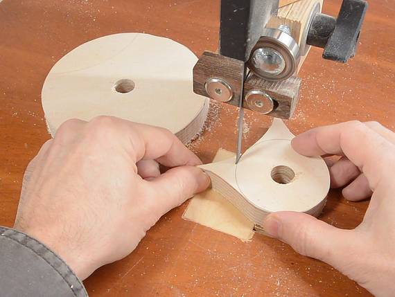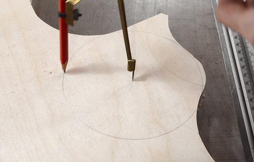 I started by drawing two circles on a scrap of Baltic birch plywood. I like to draw arcs from the edges to work out how close to the edge I can draw a circle.