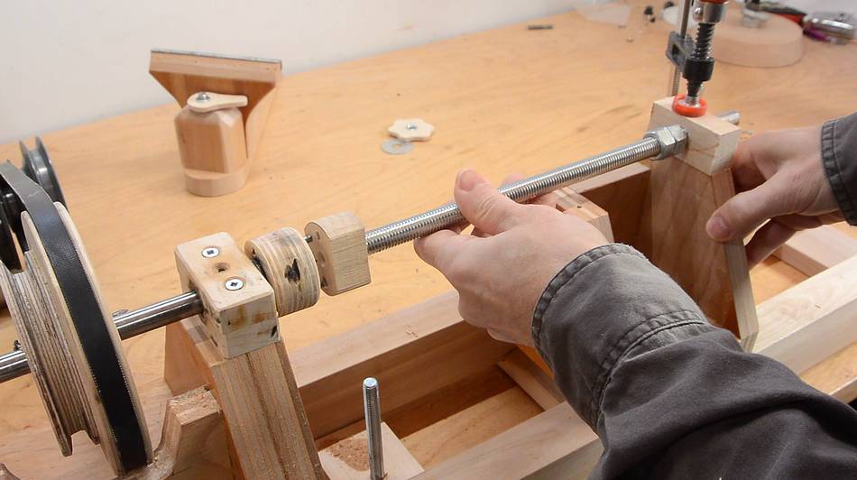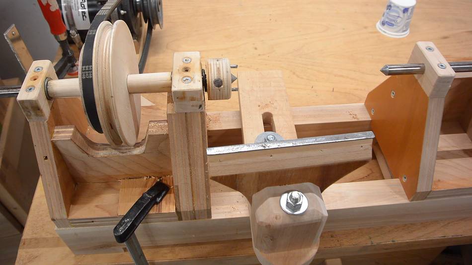 I thought I couldn't really do that with the threaded rod because the threads would chew up the bearings. But I gave it a try. I made a block to attach to the end of the threaded rod to mate with the drive center on the headstock. I also made a sacrificial bearing block, which I clamped to the tailstock. Two nuts on the threaded rod against the bearing block keep it pressed against the headstock.