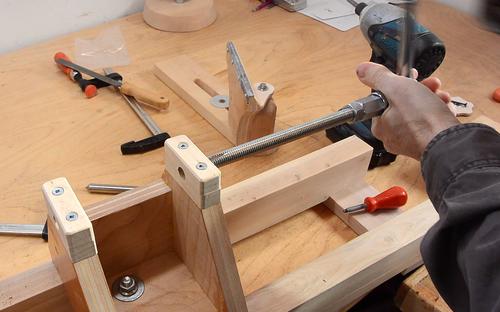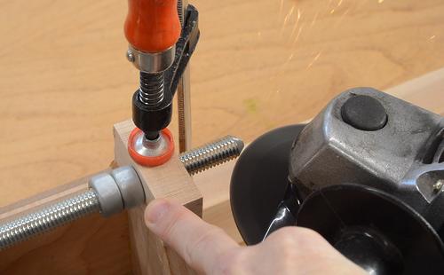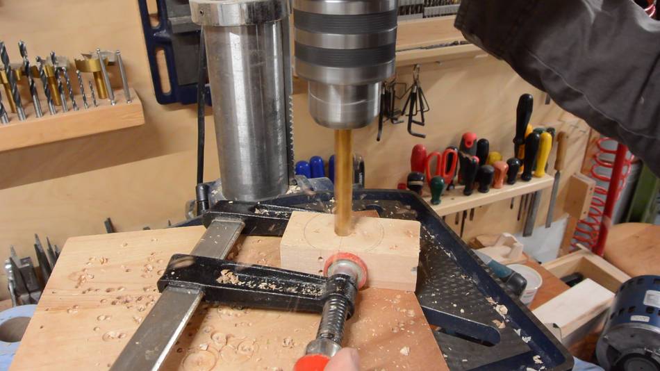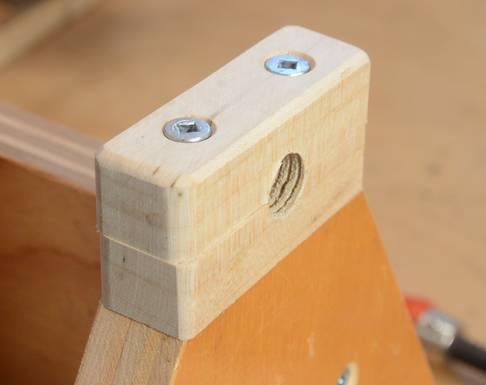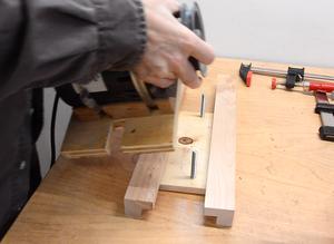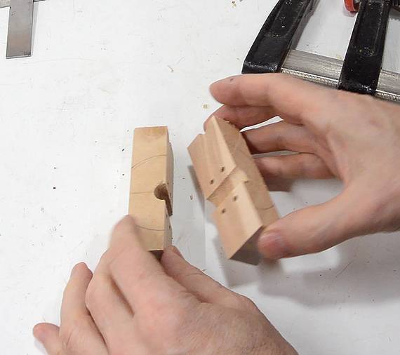 First I drilled the screw holes through it, then cut a block in half, then clamped the two halves together and drilled the hole on the line between the two.