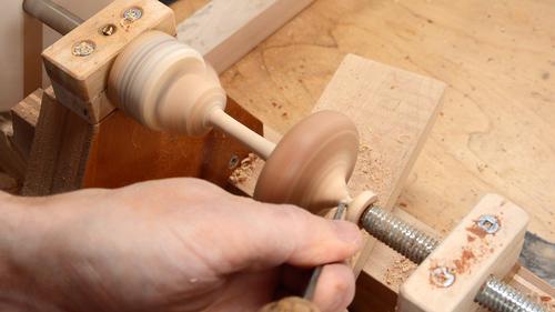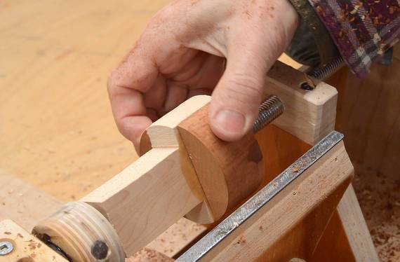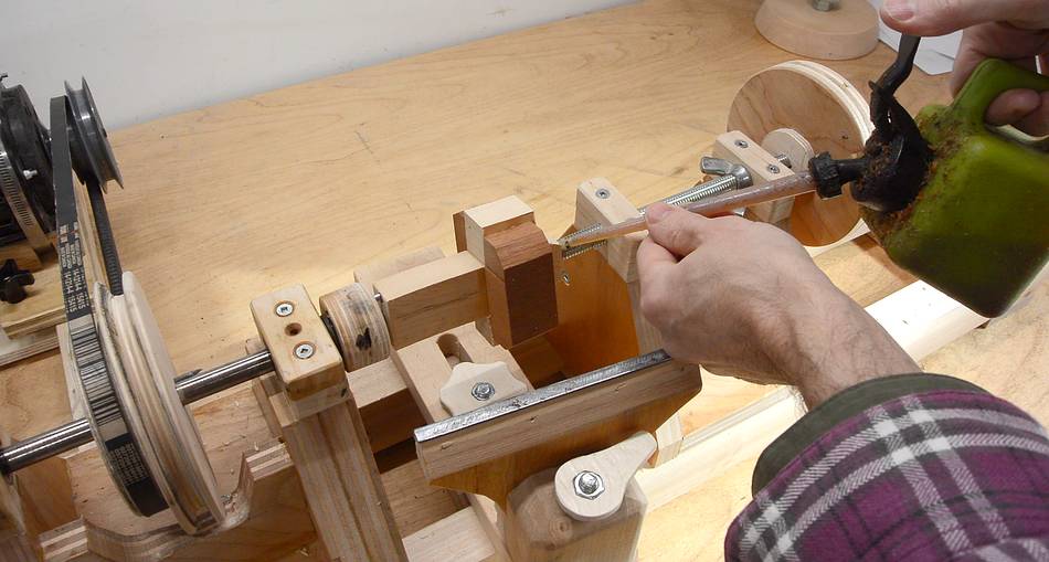 The blank mounted on the lathe. I'm adding a drop of oil where the workpiece