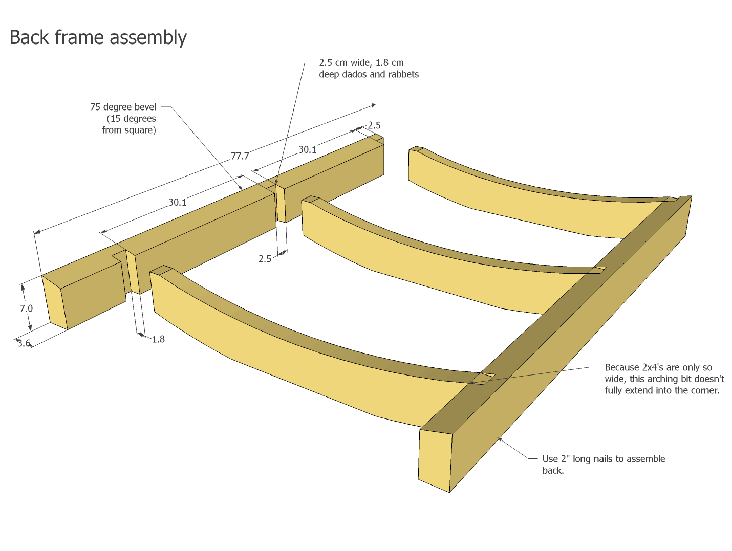 Before nailing on the back for the first chair you build, it's a good idea to just secure it with some clamps and sit in the chair. This will give you the opportunity to adjust the final seat back position before you nail it all together.