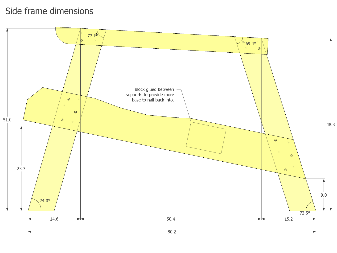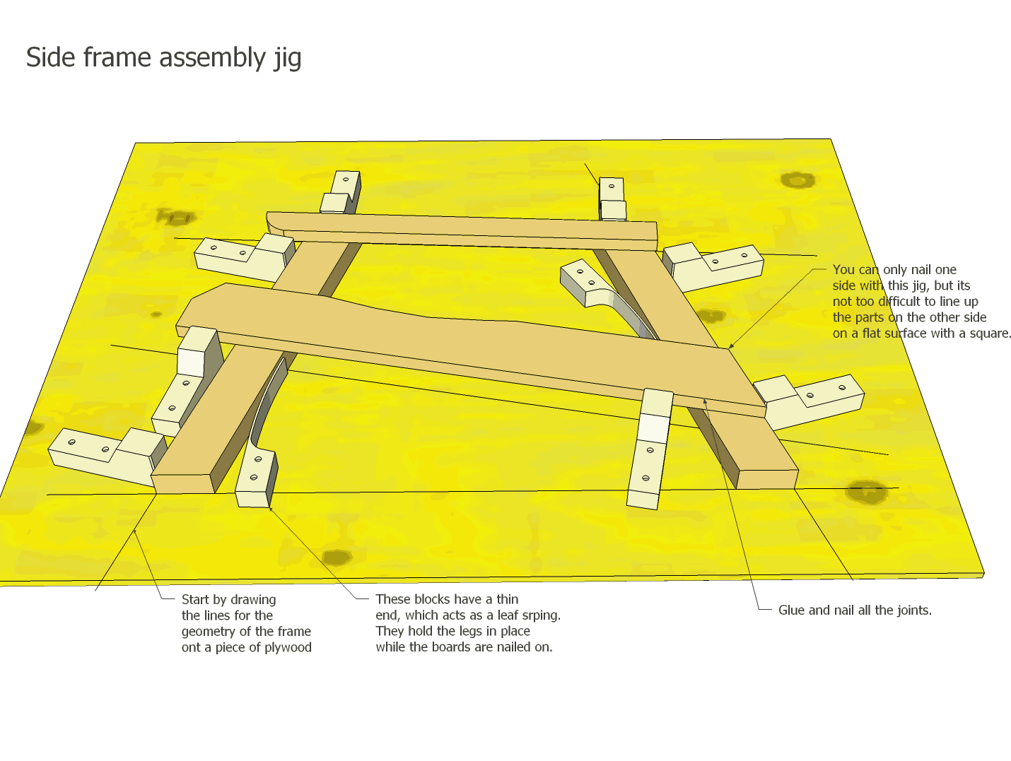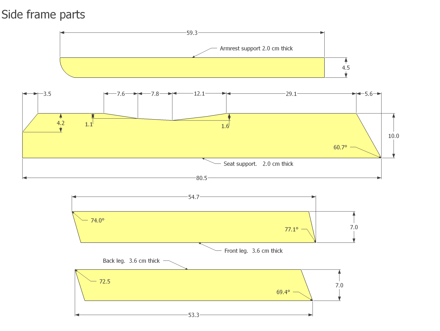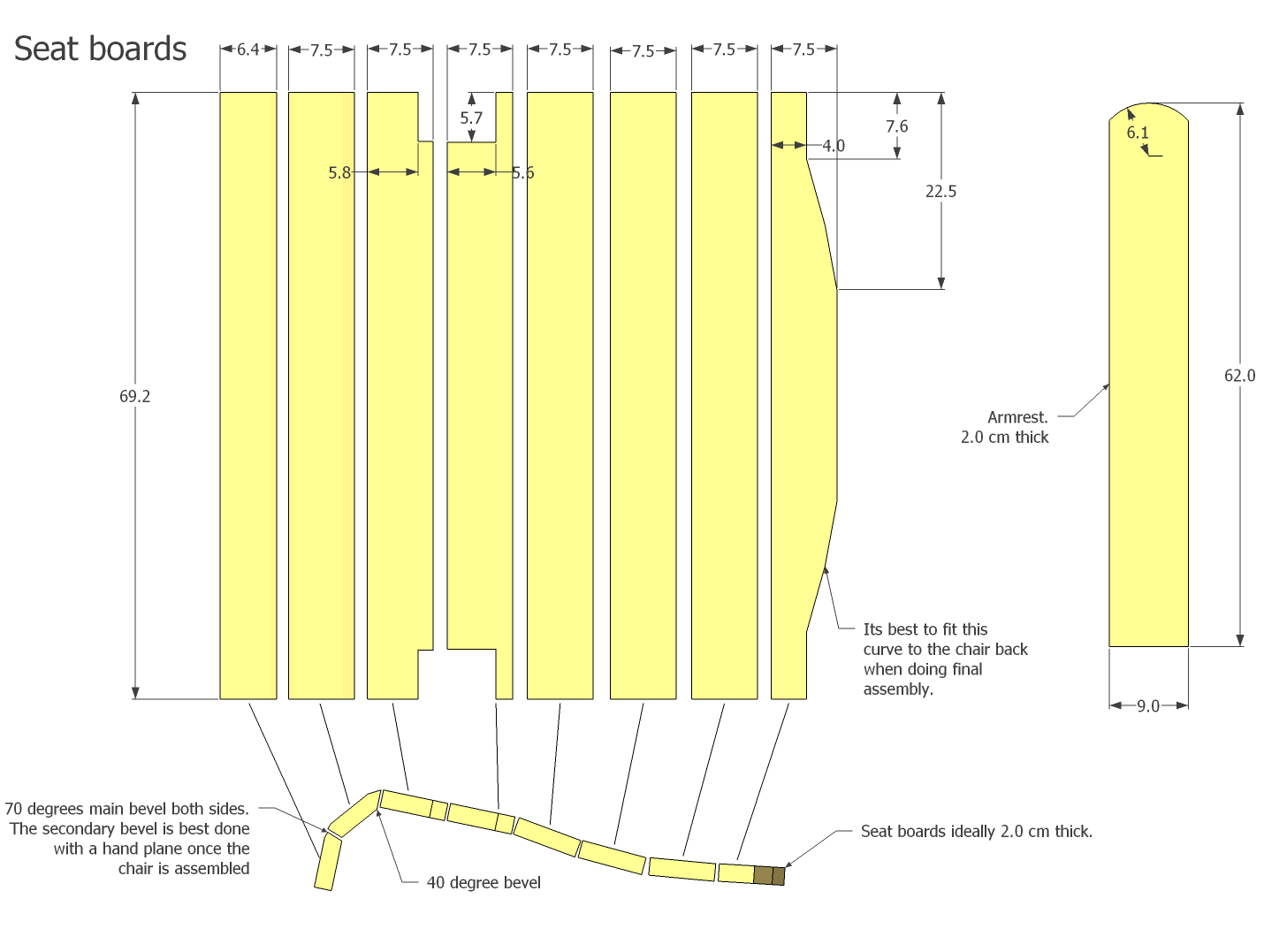 These chairs have a few more parts to them than an Adirondack chair does. Geometrically, however they are a bit easier, because they lack the many compound angles that Adirondack chairs have.