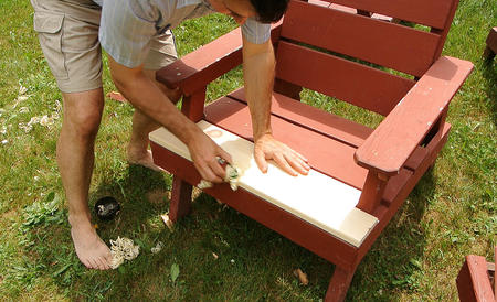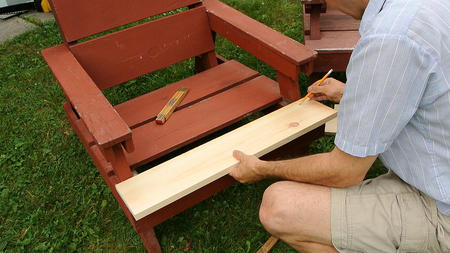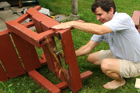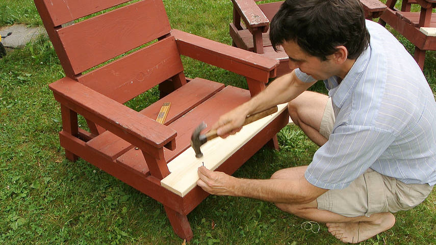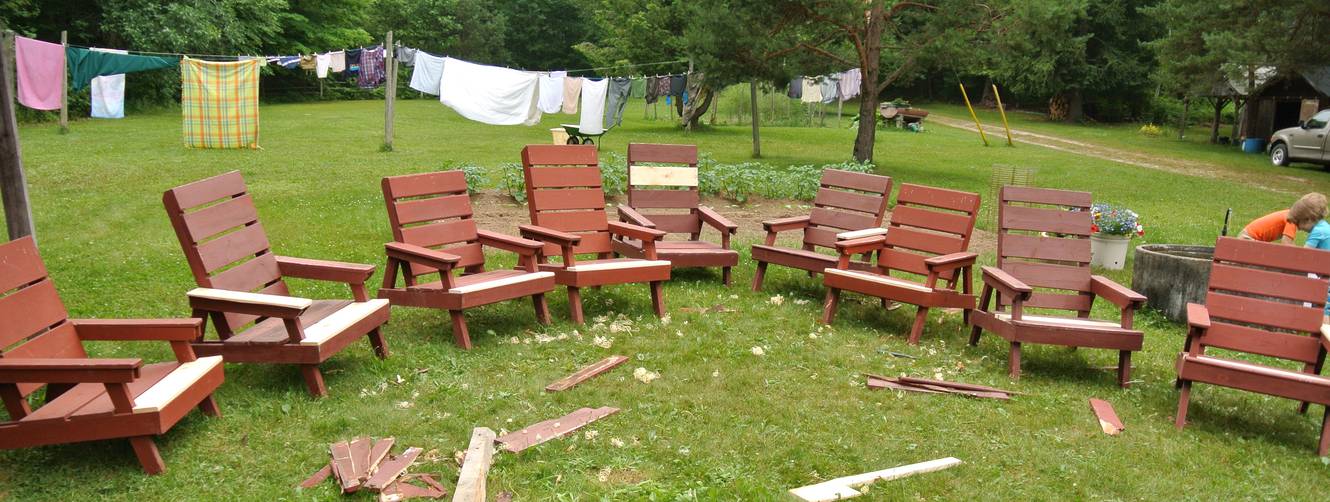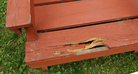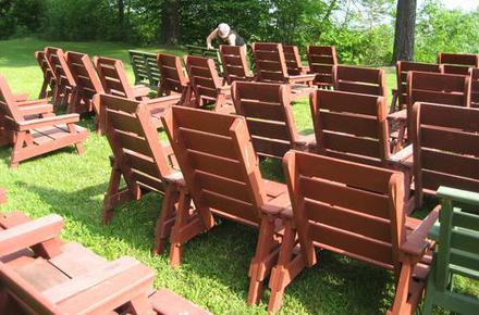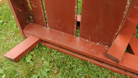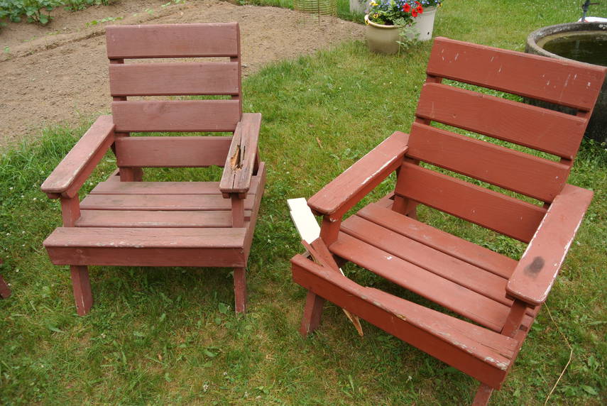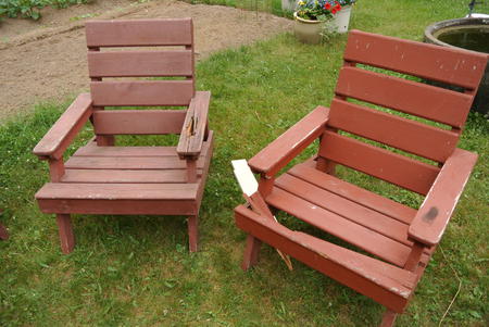 Wood rot / fixing lawn chairsThis article also available in Spanish.It's hard to predict where wood will rot, so it can be useful to examine stuff that has rotted to some degree to get a better sense of it. What prompted this adventure was that we set up all the lawn chairs at Amogla camp for my brother's wedding. With all the chairs lined up, it was a good opportunity to examine them all and see which could use repairs. My dad built the first batch of these some time around 1984, with more batches over the following years. So some of these chairs have been outside for nearly 30 summers now and a few of the seat and armrest boards have rotted. Considering the time, I was surprised they weren't any worse.