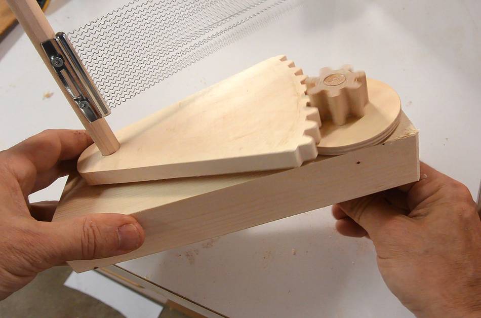 I thought about it and figured some mechanism to turn a larger rotation in the adjustment knob to a smaller rotation of the snare would be cool. And gears would be ideal for that! So I made those (using my gear program) before Paul came back two days later.