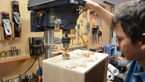 Drilling a hole to recess the adjustment knob. Paul had come for the evening,