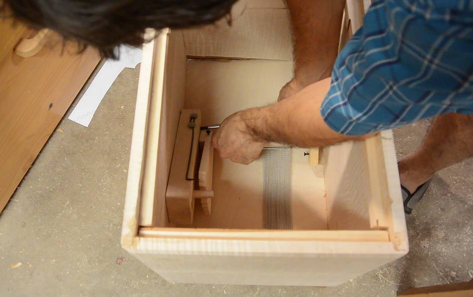 While Paul glued on the front, I worked on the snare adjustment mechanism.