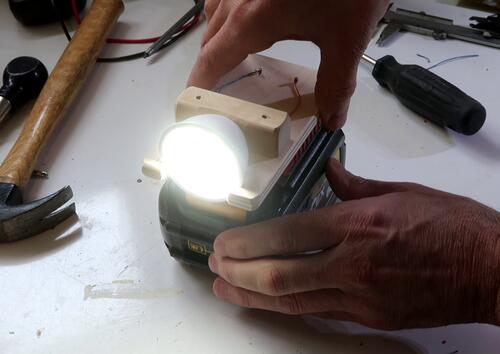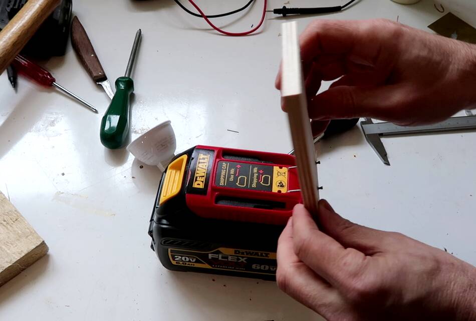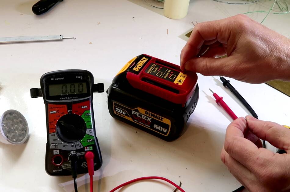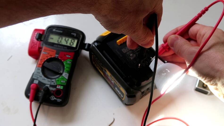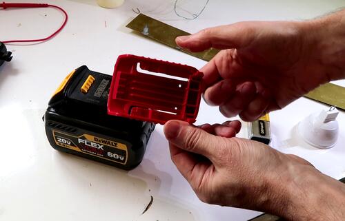 A note of caution When I built this I assumed the battery pack would have under-voltage protection built in, because the cheap 12-volt Ryobi battery packs I have will automatically shut off on under-voltage. But DeWalt tools have under-voltage cut-off in the tool itself, so the batteries don't need to. I imagine this is also the case for most larger cordless tools. So don't plug one of these in and leave it on overnight.