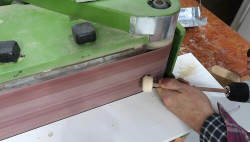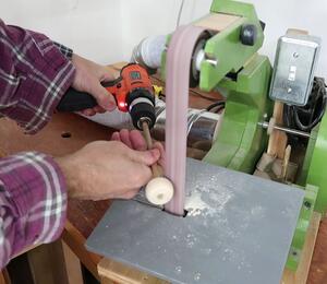 After gluing it to the stick, I spun it against the belt sanders to turn it