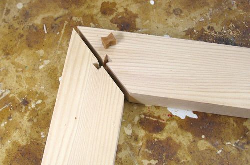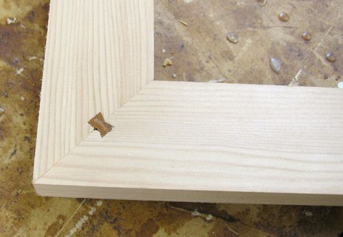 It consists of a machine to cut blind dovetails keyways into the miters of a frame, and these little plastic dovetails keys that are then driven into the dovetail keyways.
