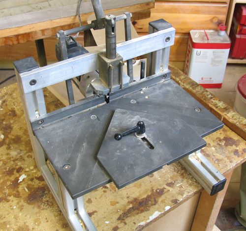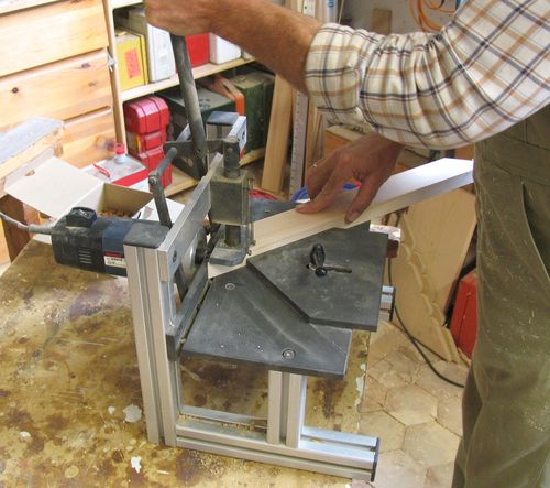 Operating the machine is very simple. The workpiece is slid into the machine, then the router is turned on, and the lever pulled forward. Pulling the lever forward first lowers the clamping block, securing the work piece in place, and then pulls the router up into the wood.