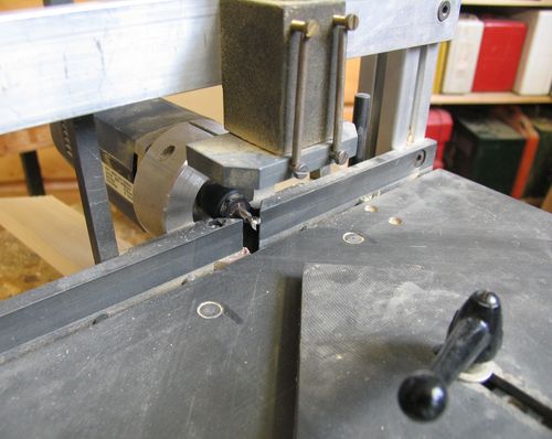 A close-up view of the cutter head. The cutter head normally only rises above the level of the table while cuts are made. I jammed a piece of wood under the router to take this photo, to show the cutter head up without a work piece obstructing it.