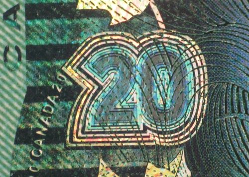 This "20" is part of the security strip down the left side of a Canadian $20 bill.