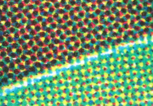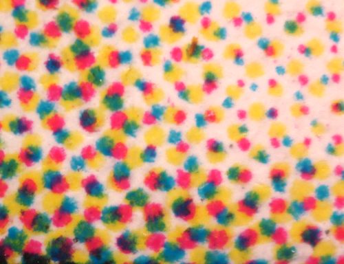 Colour dots from a glossy magazine page. This image is 2 mm across.