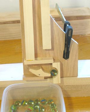 the top. The horizontal piece of wood above the rocker has a hole in it to align the marbles