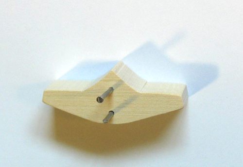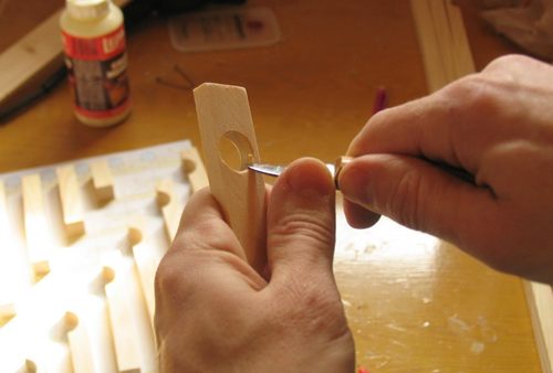 I used 1 1/4" finishing nails for the pivots of the toggles. I drilled 3/64" holes in the toggles,