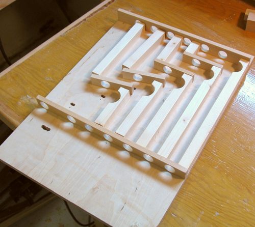 To make a base for the machine, bevel the edge of a piece of 2x6 at 17 degrees, and screw the machine to it. Hopefully, this angle should be sufficient to keep the marbles from getting ejected out the front of the machine. If you find the marbles falling out the front, it may help to carve out the back edges of some of the holes that the marbles pass through, or just to increase the lean of the machine.