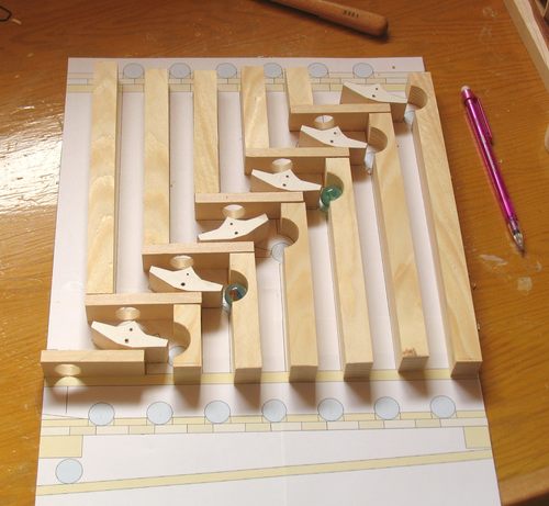 The single rocker at left is a refined version of the Lego prototype. Marbles are dropped in from