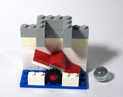 Getting this to work reliably is tricky, and I experimented with different shapes for the rocker and cavity. But as it turned out, the original Lego rocker shape was close to ideal, and I ended up nearly copying its dimensions. The cavity needs a gentle slope to hold the marble so that it doesn't push too hard against the rocker, and the granularity of Legos was just a bit too coarse to prototype that aspect.