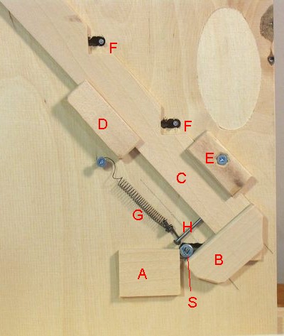 is pulled back by spring G, which pulls on the nail H in the bar.