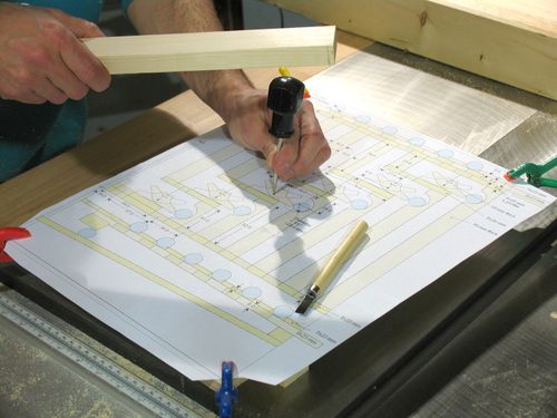I used an awl to punch the centers of all the holes that needed drilling through the template and onto the wood.