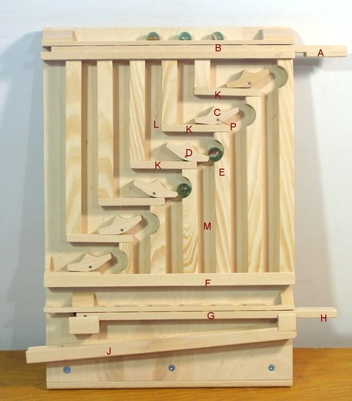 In addition to the carry marble, an input marble may also fall onto the same hole K through path L. However, the carry marble is always slightly delayed compared to the marble falling directly down path L so that the marbles will not jam each other trying to fall down the same hole at the same time.