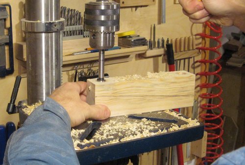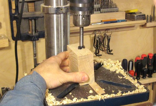 I could have tilted the drill press table, but I don't like doing that. I have the table set to dead-square and the screw tightened really hard. That way I can count on my drill press table always being square. Its easier to just put the piece on a slight wedge than it is to mess with the drill press table's angle.