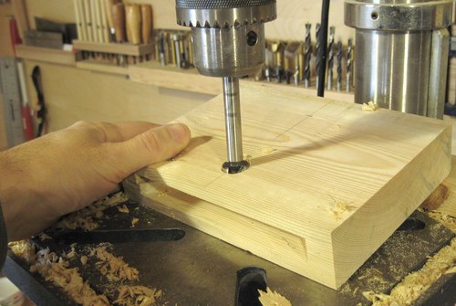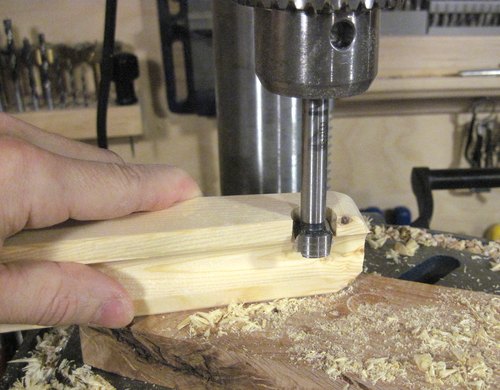 with a forstner bit. The hole is drilled at a slight angle. I angled