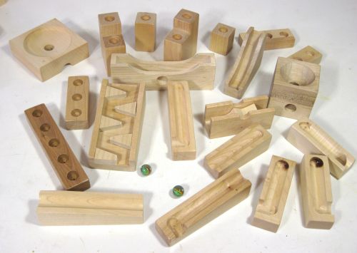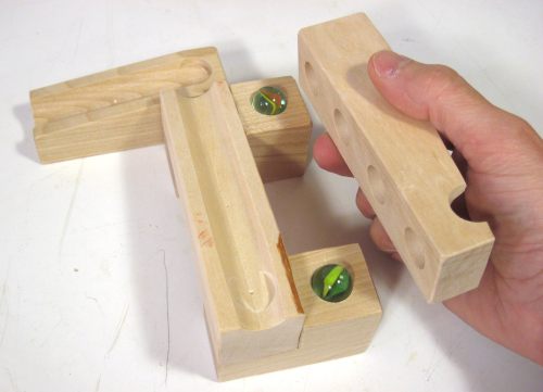 the tops and bottoms of the blocks. To interlock the blocks, a marble is placed