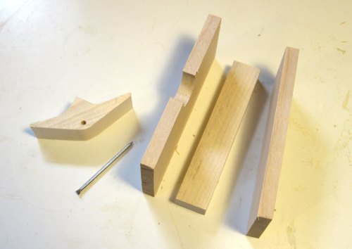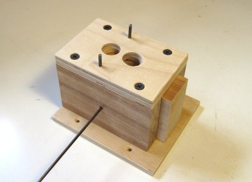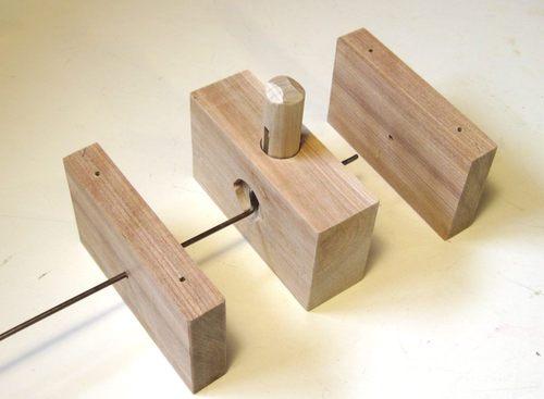 And the wooden crank looks much nicer. The coat hanger / dowel coupling is achieved by inserting the coat hanger wire into a hole in the end of the dowel. The dowel is also slit at the end, and the bracket around the dowel clamps it firmly onto the wire.