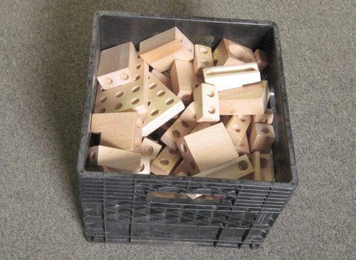 The building blocks fill up a milk crate nearly to the top if thrown in loosely.