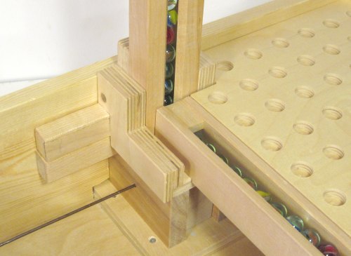 I don't use the interlock all the time, just for certain track elements, especially where the marbles have to go around a corner - after twenty or so marbles, the tracks end up shifting a bit. And with each turn of the crank dropping one marble onto the top of the track, running twenty marbles down the track happens awfully fast. In fact, for elaborate runs, I end up pumping more than ten marbles to the top before the first marble even makes it all the way down.