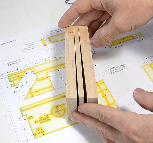 Note the three lines going across the middle layer. These are slight indentations marked on the middle layer templates. I cut a slight notch where each of these is to mark where holes need to be drilled later.