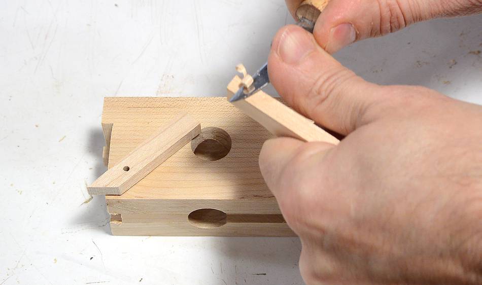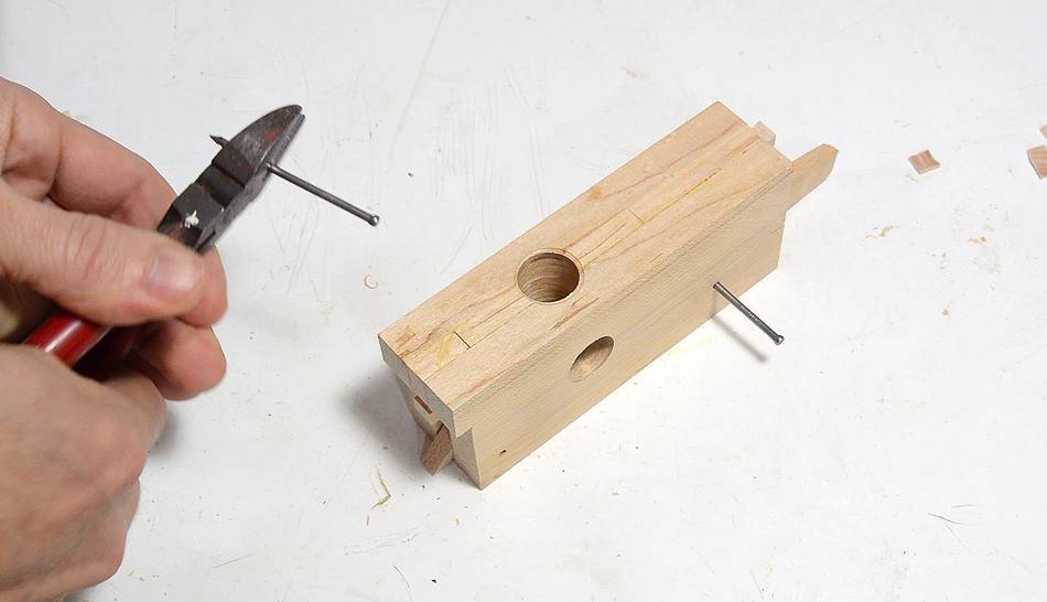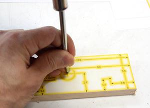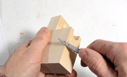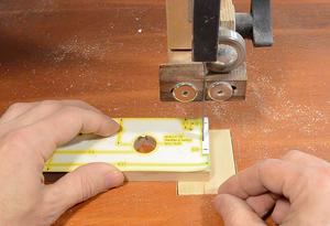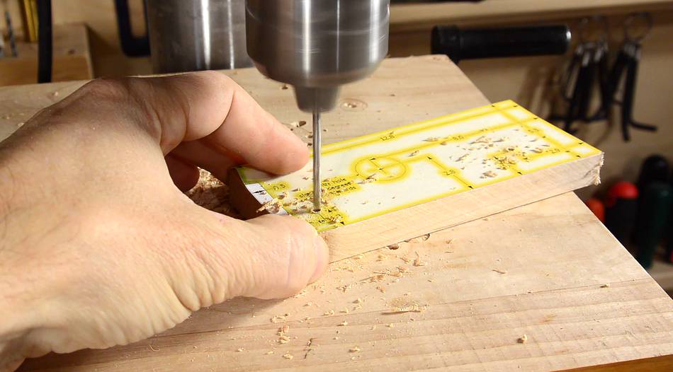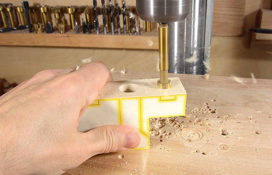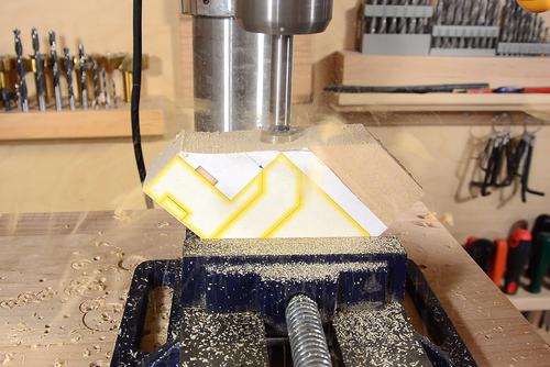 But I found cutting the block larger than needed and cutting a surface at 45-degrees makes it easy to start the hole. The drill depth needs to be as far as the outside of the 45-degree corner (on the right side of the outline of the bent hole shown on the paper template).