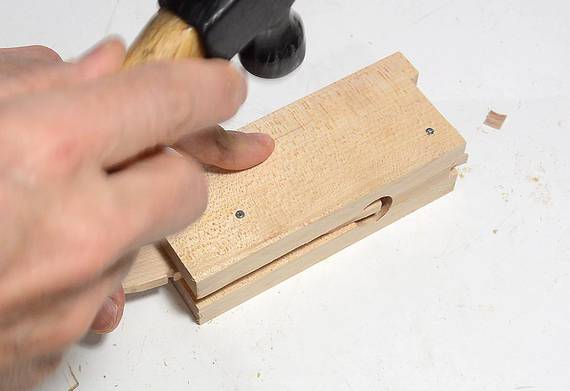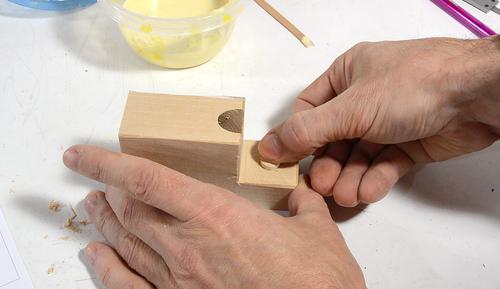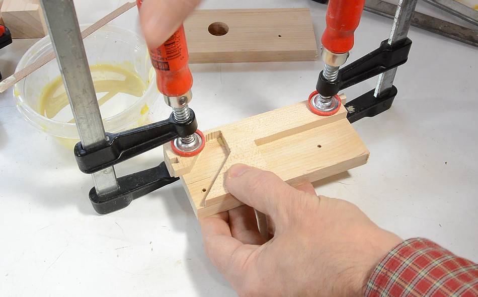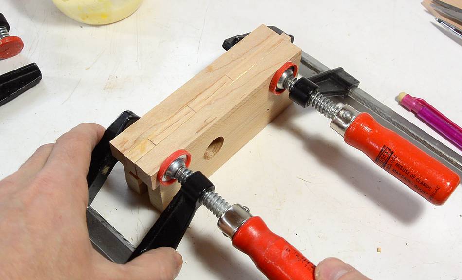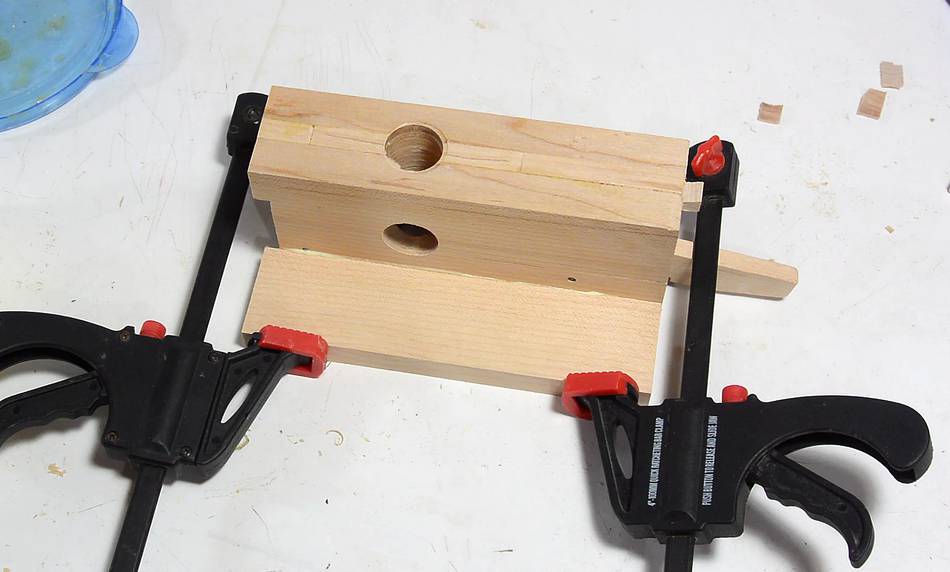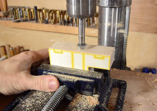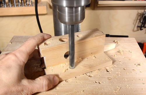I used a drill press vise to hold the workpiece. If you don't have a drill press vise, you could clamp the block between two larger pieces of wood to hold it in place.