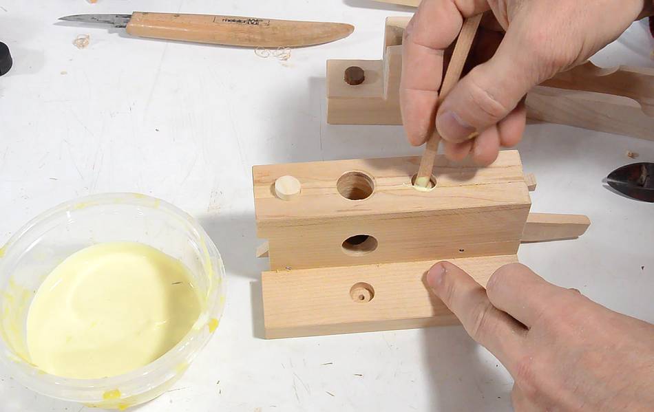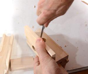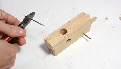 Cutting dowel pieces to go in the holes. 15/64" is an odd size. Dowels at