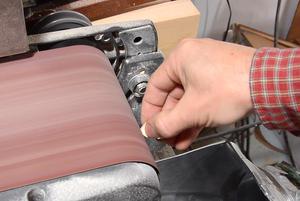 I chamfer one end of the buttons on the belt sander. This would be easier to do with the whole dowel, before cutting pieces off, but that would mean going back and forth between the belt sander and the bandsaw.