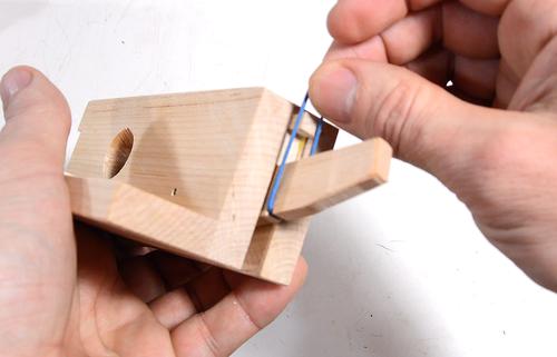 Another rubber band is used to force the small lever on the other side, which prevents the marbles from falling back down when the lever is released. That lever drops down by gravity, but not reliably so.